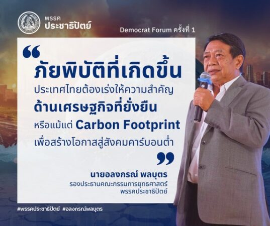 นายอลงกรณ์ พลบุตร รองประธานคณะกรรมการยุทธศาสตร์ พรรคประชาธิปัตย์ในฐานะประธานจัดงานเดโมแครต ฟอรั่มกล่าวว่า ธนาคารโลกเรียกร้องให้ประเทศไทยเร่งการเปลี่ยนแปลงสู่เศรษฐกิจที่มีคาร์บอนต่ำ โดยชี้ให้เห็นว่ามีโอกาสในการลงทุนที่ยั่งยืนถึงประมาณ 632 พันล้านดอลลาร์สหรัฐ (23 ล้านล้านบาท)จึงเป็นโอกาสในวิกฤติโลกเดือดโลกรวนน้ำท่วมภัยแล้งสุดขั้วที่จะเร่งขับเคลื่อน
