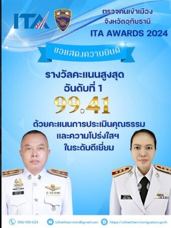 พ.ต.ท.สำรวย สมาน สว.ตม.จว.อุทัยธานี บก.ตม.5 สำนักงานตรวจคนเข้าเมือง เปิดเผยว่า ที่ได้รับรางวัล “การประเมินคุณธรรมและความโปร่งใส ในการดำเนินงานของหน่วยงานภาครัฐ (Integrity and Transparency Assessment: ITA) ITA AWARDS 2024 อันดับที่ 1 ของประเทศ ของหน่วยงานระดับต่ำกว่ากรม (สำนักงานเขต กรุงเทพมหานคร อำเภอ และสถานีตำรวจ ทั่วประเทศ ประจำปีงบประมาณ 2567” เป็นอันดับที่ 1 ของสำนักงานตรวจคนเข้าเมืองทั่วประเทศ และอันดับที่ 1 ของส่วนราชการในจังหวัดอุทัยธานีได้รับคะแนน คิดเป็นร้อยละ 99.41 (เต็ม 100 คะแนน) ด้วยผลคะแนนรวมทั้ง 3 ด้าน ผ่านประเภท ดีเยี่ยม โดย จำแนกการประเมินข้าราชการตำรวจ ทุกนาย มุ่งมั่น ร่วมแรงร่วมใจ เพื่อปฏิบัติติหน้าที่ด้วยความมุ่งมั่น ตั้งใจ ตามหลักธรรมาภิบาล นำมาซึ่งผลคะแนนที่บ่งบอกถึงคุณภาพในการปฏิบัติติราชการ โดยได้นำเอาหลักการมีส่วนร่วมของข้าราชการที่ปฏิบัติงานในหน่วย ลูกจ้าง ภาคีเครือข่าย ร่วมแรงร่วมใจ ในการทำงานโดยมุ่งหวังในมิติการมีส่วนร่วมของข้าราชการตำรวจและประชาชนร่วมในการมีส่วนร่วม