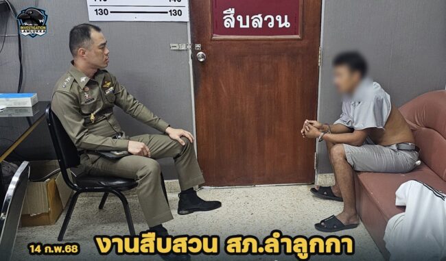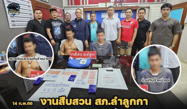 ต่อมาวันนี้ (14 ก.พ.68) ได้มีสายลับแจ้งว่า นายภพ(นามสมมุติ)หรือโอ๊ตฯ ผู้ต้องหาตามหมายจับดังกล่าว ได้เข้ามาหลบซ่อนตัวอยู่ที่บ้านเพื่อนชื่อนายเพื่อน(นามสมมุติ)หรืออ๋องฯ ชาว ต.บึงคำพร้อย อ.ลำลูกกา จว.ปทุมธานี เจ้าหน้าที่ตำรวจ สภ.ลำลูกกา ภายใต้การอำนวยการและสั่งการของ พ.ต.อ.ถิรเดช จันทร์ลาดผกก.สภ.ลำลูกกา ,พ.ต.ท.ศิวะอิศ วรรณแก้วราช รอง ผกก.สส.สภ.ลำลูกกา, พ.ต.ท.อิทธิกร สง่ากร สว.สส.สภ.ลำลูกกา เจ้าหน้าที่ตำรวจชุดจับกุมประกอบด้วย ร.ต.อ.โสภณ โสถิระสินธร รอง สว.สส.ฯ, ร.ต.ต.สมดี ทัศประไพร รอง สว.(ป.)ฯ, ร.ต.ต.ประกิจ แก้ววิฑูรย์ รอง สว.(สส.)ฯ , ด.ต.วิลาศ โนนพะยอม ผบ.หมู่ (ป.) ฯ, ด.ต.ทิพย์เนตร นาเม็ง ผบ.หมู่ (สส.)ฯ, จ.ส.ต.ศักรินทร์ บุญประเสริฐ ผบ.หมู่ (สส.)ฯ, จ.ส.ต.อดิศร เสนสนาม ผบ.หมู่ (สส.)ฯ และ ส.ต.ต.ไอศูรย์ ทองสุกดี ผบ.หมู่ (คฝ.)ฯ จึงได้เข้าไปตรวจสอบพบนายภพ(นามสมมุติ)หรือโอ๊ตฯ และนายเพื่อน(นามสมมุติ)หรืออ๋องฯ อยู่ภายในบ้านหลังดังกล่าว พร้อมตรวจพบยาเสพติด (ยาบ้า) จำนวน 553 เม็ด จึงได้ร่วมกันจับกุมตัวผู้ต้องหา บริเวณ บ้านเลขที่ 39/243 หมู่ 19 ต.บึงคำพร้อย อ.ลำลูกกา จว.ปทุมธานี พร้อมด้วยของกลาง ยาบ้า จำนวน 553 เม็ด 1. นายภพ(นามสมมุติ) ชาว ต.ลำลูกกา อ.ลำลูกกา จว.ปทุมธานี 2. นายเพื่อน(นามสมมุติ)หรืออ๋อง ชาว ต.สัตหีบ อ.สัตหีบ จว.ชลบุรี