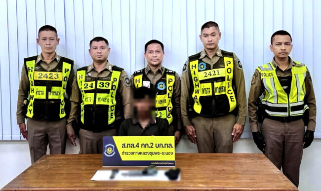 วันที่ 5 เมษายน 2568 เจ้าหน้าที่ตำรวจทางหลวง ส.ทล.4 กก.2 บก.ทล.(ชุมพร) นำโดย ว่าที่ ร.ต.ต.สุริยา ปลื้มใจ ผบ.หมู่ ส.ทล.4 กก.2 บก.ทล. ,ด.ต.สมหวัง ส่องแสง ผบ.หมู่ ส.ทล.4 กก.2 บก.ทล., ด.ต.สายชล ตั้งวงศ์ ผบ.หมู่ ส.ทล.4 กก.2 บก.ทล., ด.ต.พัทธนันท์ แดงกระจ่าง ผบ.หมู่ ส.ทล.4 กก.2 บก.ทล., ด.ต.วงศ์วริศ ทรัพย์คนาสกุล ผบ.หมู่ ส.ทล.4 กก.2 บก.ทล. ได้จับกุมผู้ต้องหา จำนวน 1 คน นายจาตุรงค์ (นามสมมุติ) อายุ 54 ปี ชาว ต.แสงอรุณ อ.ทับสะแก จ.ประจวบคีรีขันธ์ พกปืนซุกคอนโซลรถ สารภาพซื้อจากวัยรุ่นไว้เฝ้าสวน