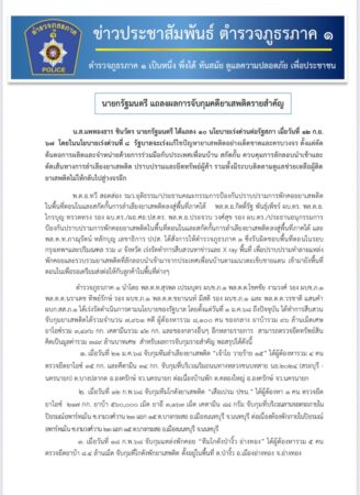 จับกุมผู้ต้องหาได้ 1 ราย คือ นายแบ็ค (นามสมมติ) อายุ 32 ปี โดยกล่าวหาว่า “จำหน่ายยาเสพติดให้โทษประเภท 1 (ยาบ้า และยาไอซ์) โดยการมีไว้เพื่อจำหน่าย อันเป็นการกระทำเพื่อการค้า อันเป็นการกระทำเพื่อการค้า เป็นการก่อให้เกิดการแพร่กระจายในกลุ่มประชาชน และทำให้เกิดผลกระทบต่อความมั่นคงของรัฐหรือความปลอดภัยของประชาชนทั่วไป” ในชั้นจับกุมผู้ต้องหา ให้การรับสารภาพตลอดข้อกล่าวหา ซึ่งเจ้าหน้าที่ตำรวจจะได้ทำการสืบสวนขยายผลหาผู้ร่วมกระทำความผิด ในคดีนี้อย่างเร่งด่วนต่อไป