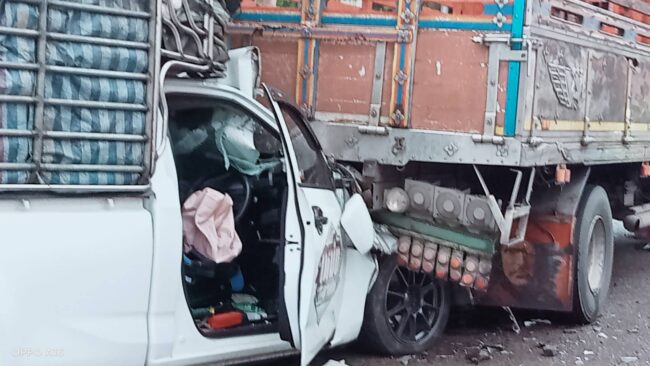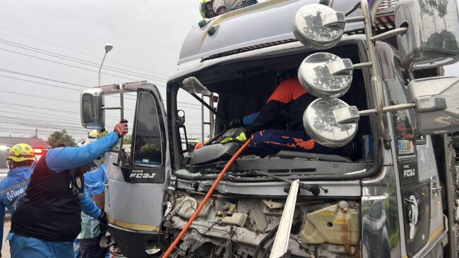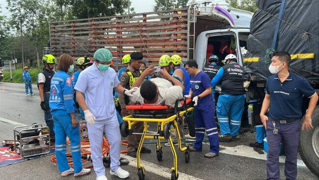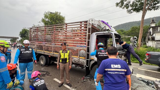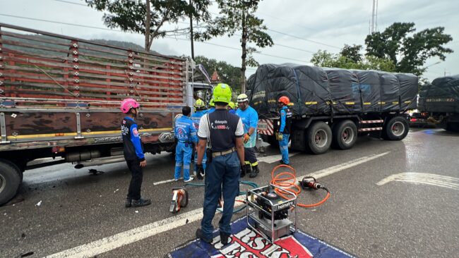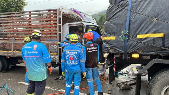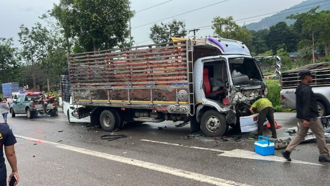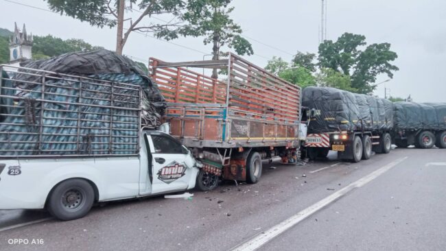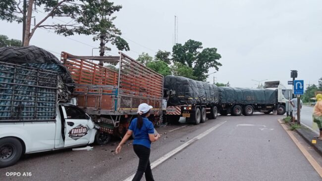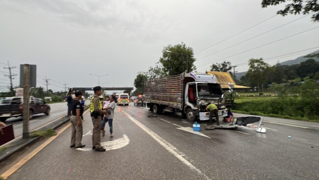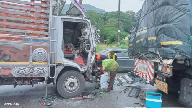 ฝนตกไม่ชินทาง รถรั้วพุ่งชนท้ายรถบรรทุก6 ล้อ จนไหลไปอัดท้ายรถพ่วง 22 ล้อจุดกลับรถทางหลวงเขาพางบาดเจ็บติดภายในกู้ภัยเร่งช่วยเหลือ