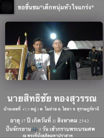 นายสิทธิชัย ทองสุวรรณ อายุ27ปี ซาบซึ้งในพรรคกรุณาที่พระองค์ท่านได้เดินทางลงไปช่วยเหลือประสบนิกรของพระองค์ท่านไม่ว่าจะเป็นความลำบากยากแค้นหรือจะเป็นที่ทุรกันดารห่างไกลความเจริญท่านก็เดินทางไปเยี่ยมและช่วยเหลือประสพนิกรของพระองค์ท่านให้กินดีอยู่ดีและในวันนี้ได้ออกมาเดินเพื่อจะเข้าร่วมพิธีถวายความอาลัยแก่พระองค์ท่านที่พระราชวัง ถึงแม้ฝนจะตกสร้างความลำบากแต่ก็ภูมิใจที่ได้ออกมาทำเพื่อเป็นตัวอย่างให้กับประชาชนรุ่นหลังได้เห็นถึงความจงรักภักดีต่อสถาบันพระมหากษัตริย์และในครั้งนี้ก็ได้เดินทางจากอำเภอไชยาจังหวัดสุราษฎร์ธานีมุ่งหน้าไปยังกรุงเทพมหานครก็ใช้ระยะทางประมาณ 600 กว่ากิโลในวันนี้เดินทางมาถึงอำเภอหลังสวน ก็ยังเหลือระยะทางอยู่ประมาณ 540 กว่ากิโลแล้วก็จะเดินวันละแปดกิโลคาดว่าน่าจะเดินทางได้วันละ 30 ถึง 50 กิโลโดยประมาณ. มุ่งหวังจะเดินทางให้ถึงพระราชวังภายใน 15 ถึง 20 วันในครั้งเมื่อพระบาทสมเด็จพระเจ้าอยู่หัวรัชกาลที่เก้าได้ทำกิจกรรมปั่นจักรยานจากอำเภอไชยาไปถึงพระราชวังร่วมกิจกรรมใช้เวลาเดินทางห้าวัน เพื่อเข้าร่วมพิธี