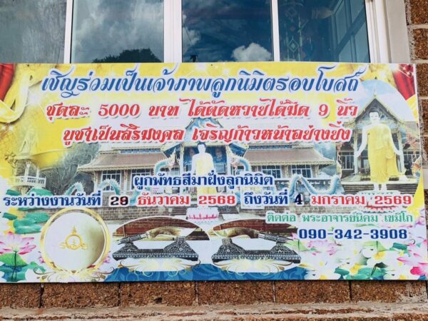 พระครูวิโรจน์เขมมากร เจ้าอาวาสวัดโนนสว่าง เปิดเผยว่า ทางวัดได้จัดเตรียมพิธีกรรมตามประเพณี พร้อมเชิญชวนผู้มีจิตศรัทธาร่วมเป็นเจ้าภาพ “ลูกนิมิต” รอบอุโบสถ ชุดละ 5,000 บาท ผู้ร่วมทำบุญจะได้รับสิทธิ์ ตัดหวายลูกนิมิตและมีดบูชา 9 นิ้ว เพื่อความเป็นสิริมงคลแก่ตนเองและครอบครัว