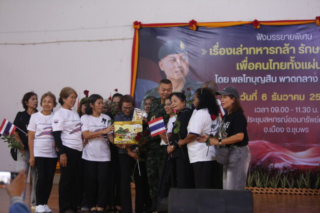 เมื่อเวลา 09.30 น. ของวันที่ 6 ธันวาคม 2568 ณ หอประชุมสหกรณ์ออมทรัพย์ครูชุมพร ตำบลวังไผ่ อำเภอเมือง จังหวัดชุมพร ได้มีการจัดงานบรรยายพิเศษ โดยมี พล.ท.บุญสิน พาดกลาง หรือที่รู้จักกันในนาม “แม่ทัพกุ้ง” อดีตแม่ทัพภาคที่ 2 ให้เกียรติเป็นวิทยากรการบรรยายจัดขึ้นในหัวข้อที่น่าสนใจและสร้างแรงบันดาลใจ คือ “เรื่องเล่าทหารกล้า รักษาอธิปไตย เพื่อคนไทยทั้งแผ่นดิน” ซึ่งได้รับความสนใจจากประชาชนและภาคส่วนต่าง ๆ ของจังหวัดเป็นอย่างมาก
