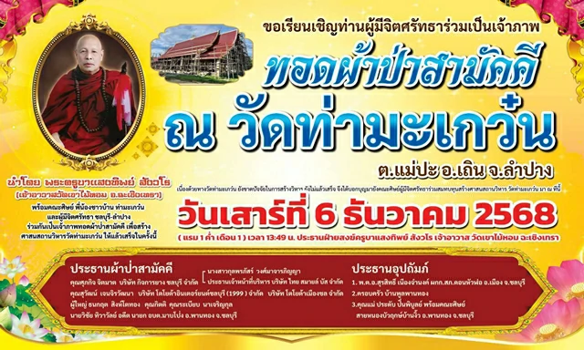 วันเสาร์ที่ 6 ธันวาคม 2568 เนื่องด้วยทางวัดท่ามะเกว๋น ต.แม่ปะ อ.เถิน จ. ลำปางยังขาดปัจจัยในการสร้างวิหาร ยังไม่แล้วเสร็จ จึงได้บอกบุญมายังคณะศิษย์ผู้มีจิตศรัทธาร่วมสมทบทุนสร้างศาสนสภาน วิหาร วัดท่ามะเกว๋น ถิ่นเก่าบ้านเกิด