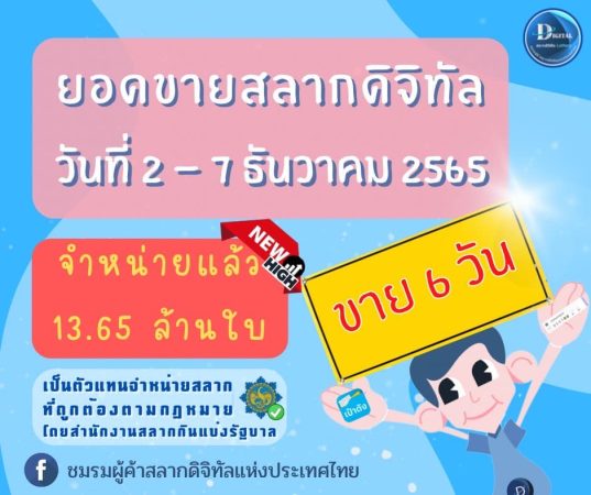 ยอดขายสลากดิจิทัล งวดวันที่ 16 ธันวาคม 2565 (6 วัน) จำหน่ายแล้ว 13.65 ล้านฉบับ เหลือสลากจำ…
