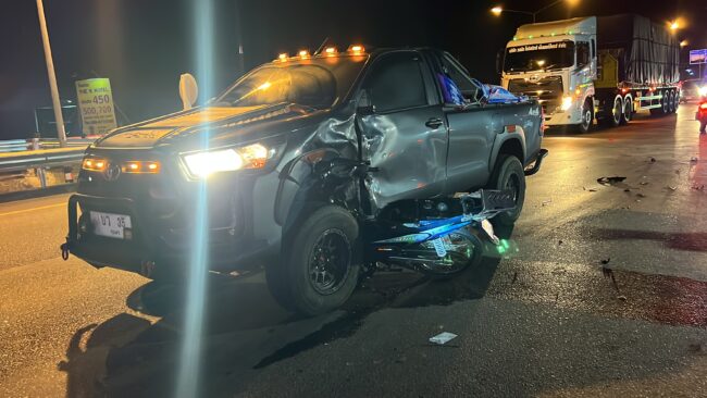 ชุมพร – ชนกลางลำ ยูเทิร์น วัดใจขุนกระทิง จักรยานยนต์ติดในซอกล้อ รถกระบะ เสียชีวิตคาที่
