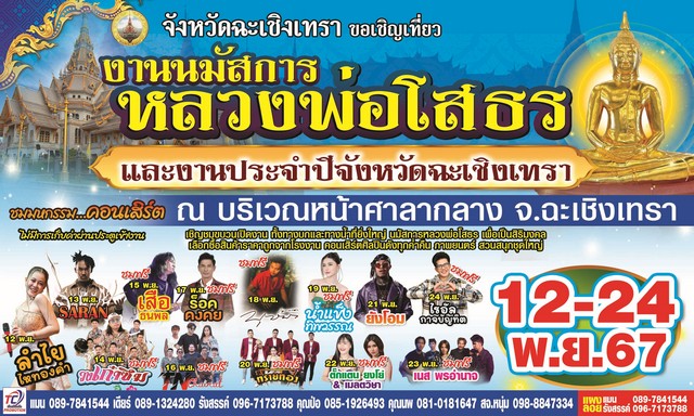 จังหวัดฉะเชิงเทรา ขอเชิญเที่ยวงาน”นมัสการหลวงพ่อโสธร และงานประจำปีจังหวัดฉะเชิงเทรา“ ระหว่างวันที่ 12-24 พ.ย. 67 รวม 13 วัน 13 คืน การจัดงานนมัสการ หลวงพ่อโสธรและงานประจำปีจังหวัดฉะเชิงเทรา จัดขึ้นเพื่อส่งเสริมขนบธรรมเนียมประเพณี วัฒนธรรมอันดีของท้องถิ่น ประเพณีลอยกระทง และการท่องเที่ยวของจังหวัดฉะเชิงเทรา ให้เป็นที่รู้จักอย่างแพร่หลายและเป็นการกระตุ้นเศรษฐกิจของจังหวัดฉะเชิงเทรา กิจกรรมภายในงานมีมากมาย ได้แก่ พิธีบวงสรวงองค์หลวงพ่อโสธร พิธีเปิดงาน ขบวนแห่องค์หลวงพ่อโสธรทางบก และทางน้ำที่ยิ่งใหญ่ตระการตา การจัดโต๊ะหมู่ถวายพุทธบูชาหลวงพ่อโสธร กิจกรรมงานลอยกระทง การแข่งขันกีฬาพื้นบ้านเรือเครื่องหางยาว และการแข่งขันเจ็ตสกีชิงถ้วยพระราชทานฯ